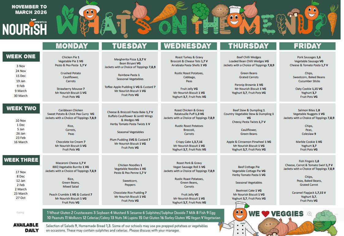 School lunches at Epping Primary are provided by Nourish Catering with high quality nutritious meals with menus tailored to appeal to our pupils.